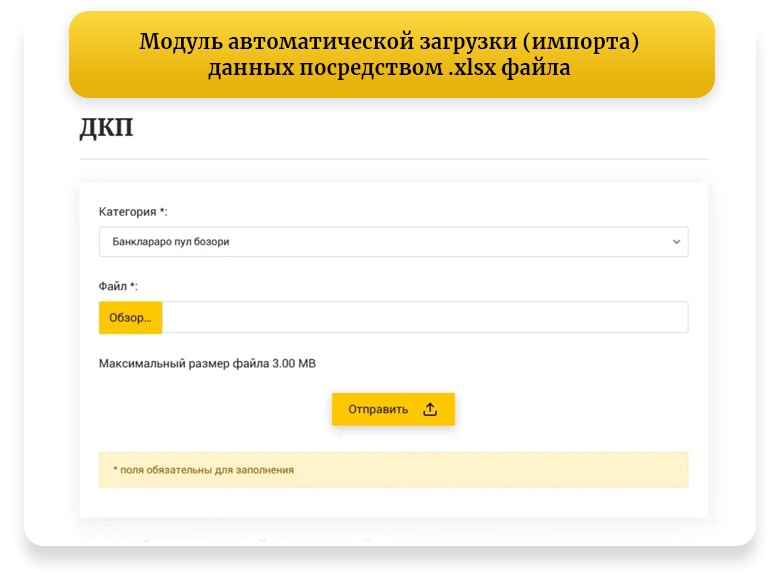 - Сайт маъмури учун шахсий ҳисобни ишлаб чиқиш: .xlsx файли ёрдамида маълумотларни автоматик юклаш (импорт қилиш) модули.