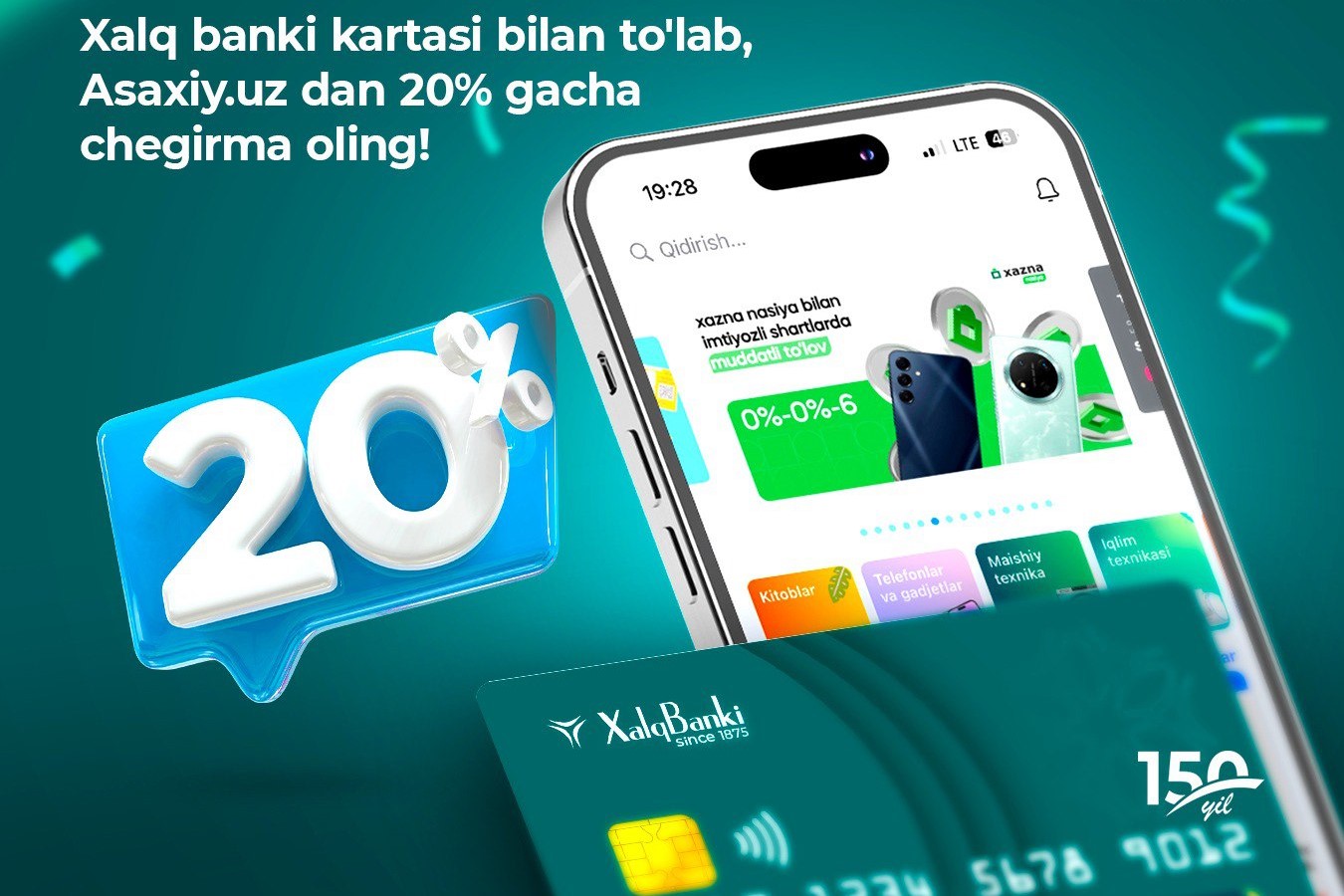 Унга кўра, эндиликда Asaxiy.uz сайти ёки Asaxiy Market иловаси орқали товар учун Халқ банки картасида тўлов қилинганда маҳсулотлар учун 2 фоиздан 20 фоизгача чегирма берилади.