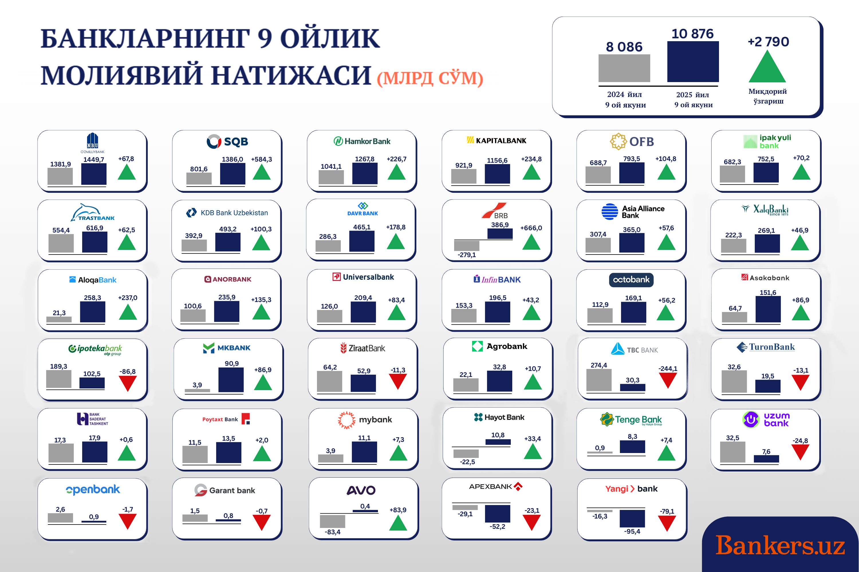 Марказий банк маълумотларига кўра, Ўзбекистон тижорат банклари 2025 йилнинг январь —сентябрь ойларида жами 10,9 трлн сўм соф фойда олди. Бу кўрсаткич ўтган йилнинг шу даврига нисбатан 2,79 трлн сўмга (+34,5%) кўпдир.