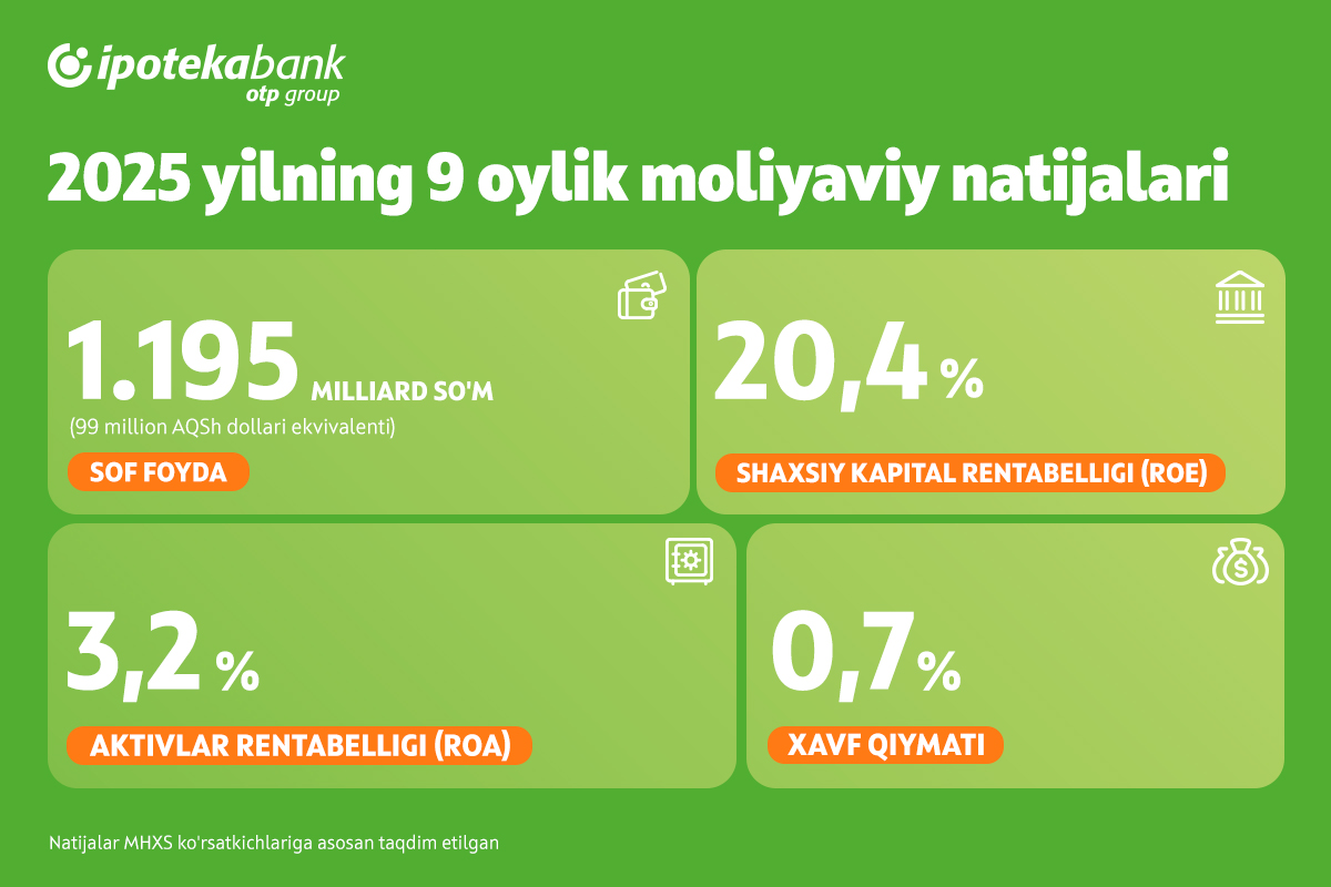 Ipoteka Bank OTP Group 2025 йилнинг 9 ойи учун Халқаро молиявий ҳисобот стандартларига (IFRS) мувофиқ молиявий натижаларни эълон қилди. Банкнинг кўрсаткичлари фойдалиликни ошириш, кредит портфелини кенгайтириш ва маблағлар манбаларини диверсификация қилишга қаратилган трансформация стратегияси доирасида изчил ўсишни намоён этмоқда.