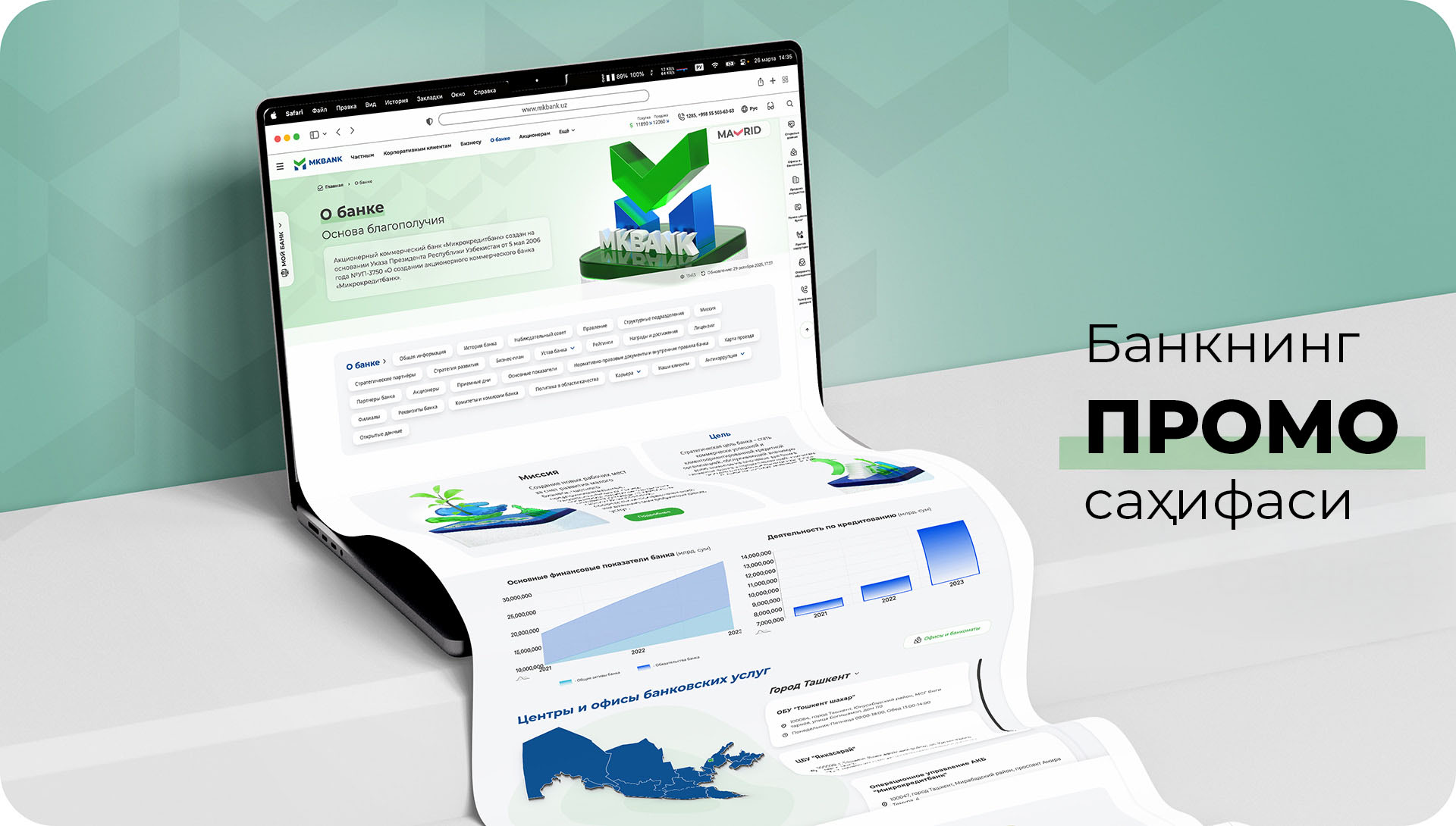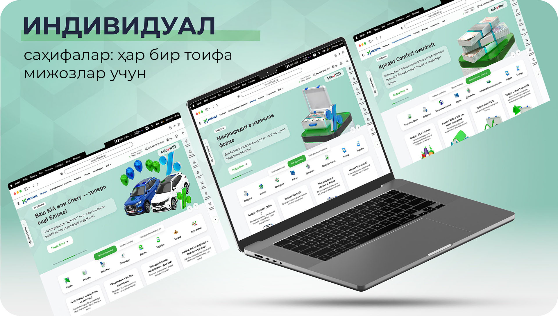 Асосий саҳифа банк хизматларига бўлган юқори талабларни ҳисобга олган ҳолда ишлаб чиқилган. Унда рекламавий слайдерлар ва энг машҳур хизматлар бўйича промо-блоклар жойлаштирилган бўлиб, улар орқали “бир босишда” кредитлар, депозитлар ёки банк карталари бўлимига ўтиш мумкин. Янги рекламавий поп-ап баннерлар ҳам ишлаб чиқилди.