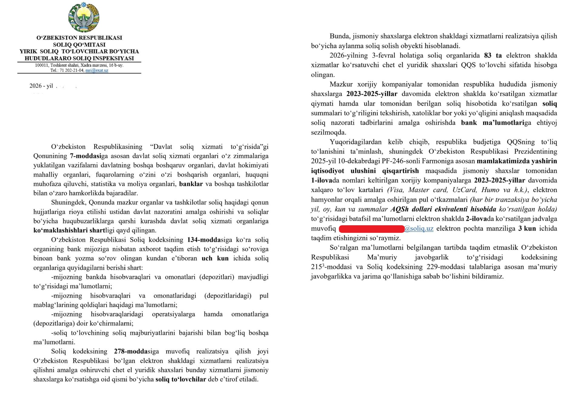 Ижтимоий тармоқларда тарқалган хат нусхасига кўра, Йирик солиқ тўловчилар бўйича ҳудудлараро давлат солиқ инспекцияси банкларга мурожаат қилиб, 2023–2025 йиллар оралиғида 83 та хорижий компанияга (электрон хизмат кўрсатувчилар) амалга оширилган тўловлар бўйича маълумотларни сўраган.