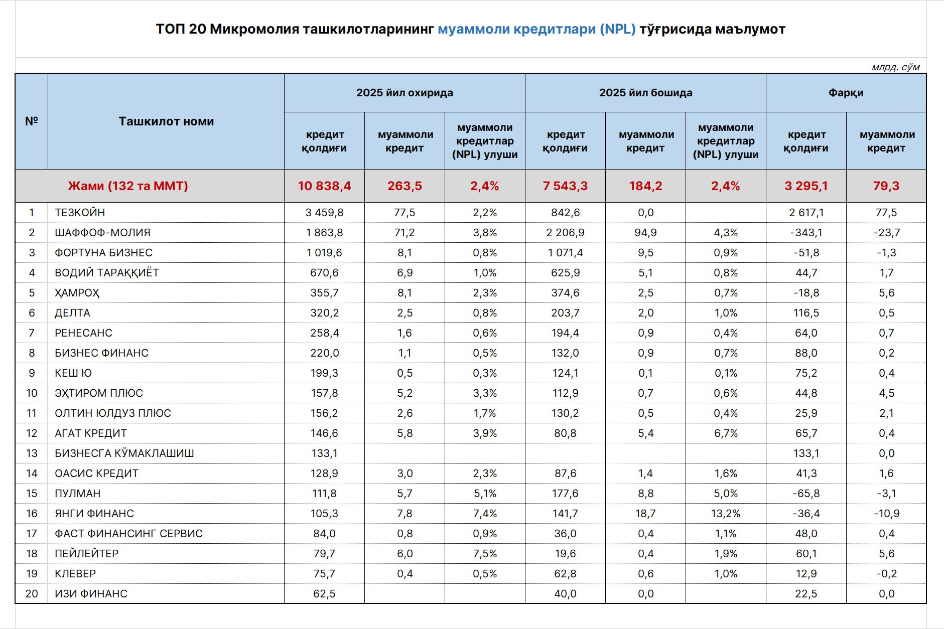 Марказий банк томонидан 2026 йил 1 январь ҳолатига микромолия ташкилотларидаги кредитлар қолдиғи ва улардаги муаммоли кредитлар улуши бўйича маълумот эълон қилинди. Унга кўра, микромолия ташкилотлари томонидан ажратилган кредитлар қолдиғи ўтган йилга нисбатан 3,3 трлн сўмга ошиб, 10 трлн 838 млн сўмга (+43,6 фоиз) етган.