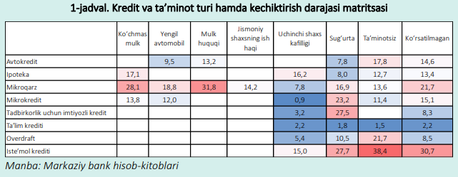 Суғурта ёки транспорт воситаси билан таъминланган автокредитлар кечиктирилган қарздорликнинг паст даражаси (7,8-9,5%) билан тавсифланади, учинчи шахслар кафиллигига эга микрокредитлар эса энг минимал кўрсаткични (0,9%) намоён этади. Таълим кредитлари эса таъминот шаклидан қатъи назар, кечиктирилган қарздорликнинг барқарор паст даражасини (тахминан 2%) сақлаб қолмоқда.