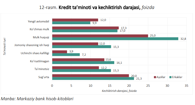 Кредит таъминоти турлари бўйича кечиктирилган қарздорлик таҳлили портфель сифатида сезиларли фарқлар мавжудлигини кўрсатади. Аниқланишича, энг юқори кечиктириш даражаси мулк ҳуқуқи билан таъминланган кредитлар бўйича кузатилади (эркакларда 32,8%, аёлларда 25,0%), шунингдек суғурта билан таъминланган кредитларда (мос равишда 21,3% ва 20,0%).