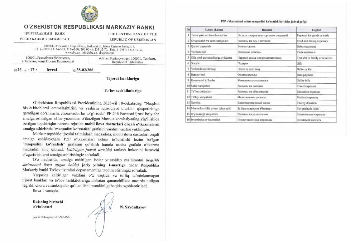 Ўзбекистонда айрим банк ва тўлов иловаларида p2p ўтказмаларини амалга оширишда “ўтказма мақсади”ни танлаш мажбурий тарзда киритилди. Маълум бўлишича, бу регулятор талаби бўлиб, Марказий банк банклар ва тўлов ташкилотларига мобил иловалар орқали ўтказмалар амалга оширилганда "ўтказма мақсадини кўрсатиш" бўйича хат юборган.
