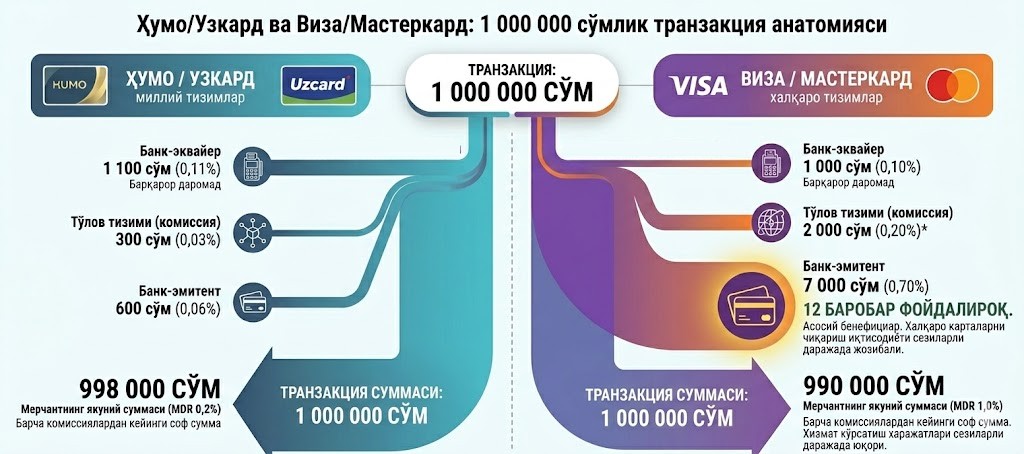 Ўзбекистон банк бозорида сўнгги пайтларда банкларнинг миллий тўлов тизимларидан кўра халқаро карталарга (Visa/Mastercard) кўпроқ урғу бераётгани сезилмоқда. Ушбу тенденциянинг сабабларини молиявий эксперт Шухрат Курбанов 1 000 000 сўмлик транзакция мисолида таҳлил қилиб берди.