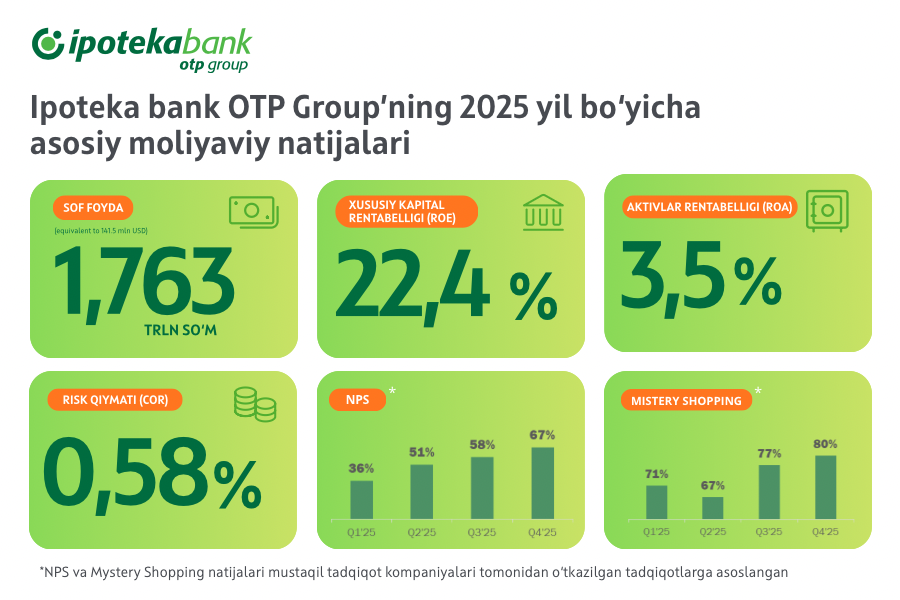 Ipoteka bank OTP Group 2025 йилни юқори молиявий кўрсаткичлар билан якунлади. Банк юқори даромадлилик, кредит портфели сифатининг барқарорлиги ҳамда мижозлар тажрибасининг сезиларли даражада яхшиланганини намойиш этди. Йил якуни бўйича банк асосий молиявий кўрсаткичларда барқарор ўсишни қайд этди, мижозлар қониқиш даражаси эса сезиларли даражада ошди.