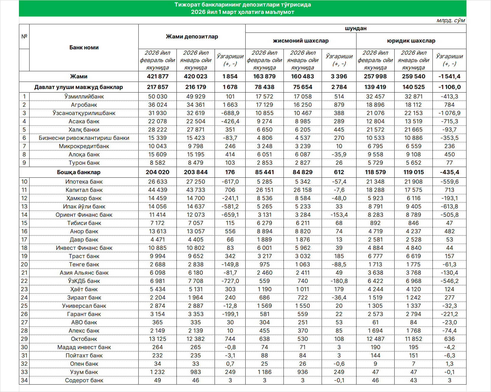 2026 йил февраль ойи якунида банкларда сақланаётган жами депозит қолдиғи 421 трлн 877 млрд сўмни ташкил қилмоқда. Бу январь ойи якунига нисбатан 1,85 трлн сўмга кўпроқ демакдир.