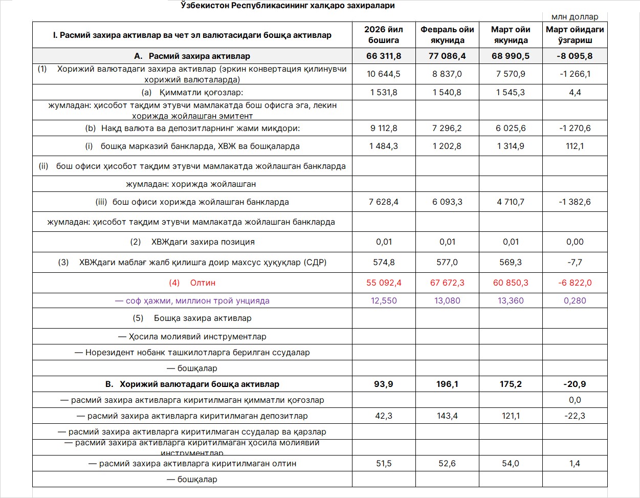 Захираларимиз таркибида олтиннинг физик ҳажми 280 минг трой унцияга кўпайиб, жами 13,3 млн трой унциядан ошган. Бироқ, март ойи давомида олтин нархининг 5174,10 доллардан 4553,95 долларгача тушиши натижасида захираларимиз таркибида олтининг қиймати жами 6,8 млрд долларга камайган.