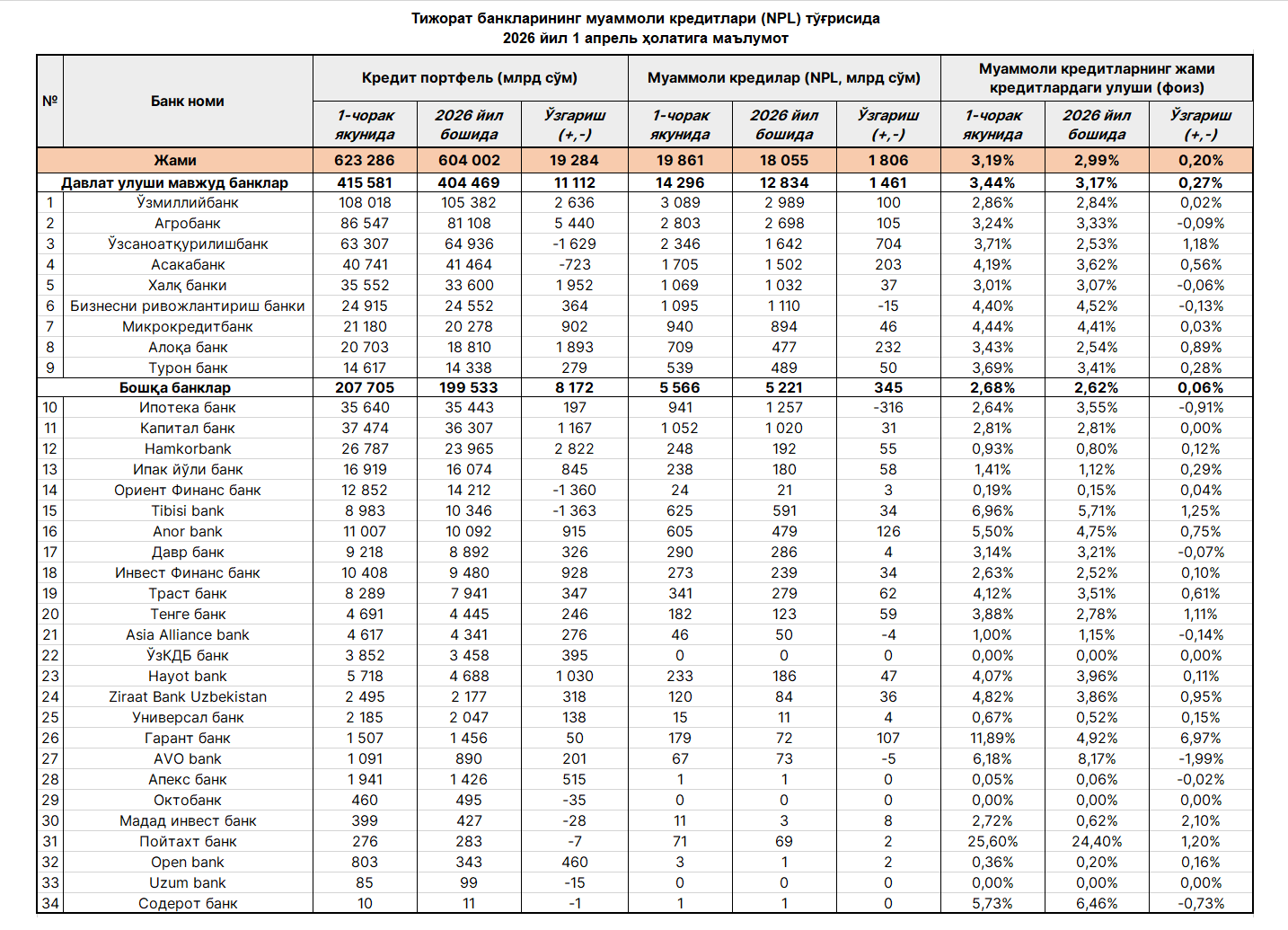 Йил бошига солиштирганда давлат банклари орасида Ўзсаноатқурилишбанк (+704 млрд сўм), Алоқабанк (+232 млрд сўм), Асакабанк (+203 млрд сўм), Агробанк (+105 млрд сўм), Ўзмиллийбанк (+100 млрд сўм) ларда NPL кўпроқ ошган бўлса, фақатгина Бизнесни ривожлантириш банкида (-15 млрд сўм) муаммоли кредитлар миқдори бироз камайган.
